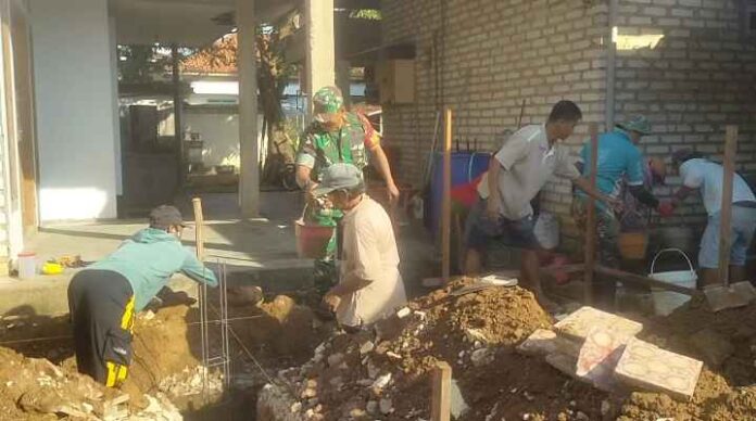 Dalam kegiatan tersebut, Sertu Agus Salim bersama sekitar 10 warga melaksanakan gotong royong pengecoran sloof serta pemasangan batu pondasi.