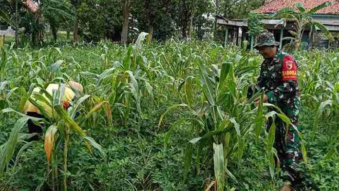 Dalam kegiatan itu, Serda Edi Suswanto turun langsung ke lahan untuk membantu mencabut rumput liar yang mengganggu pertumbuhan tanaman jagung.