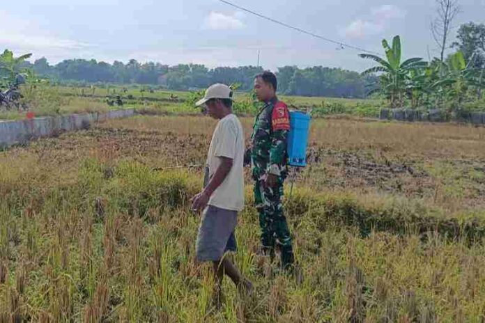 Hal itu dibuktikan oleh Babinsa Koramil 0826-06 Pademawu, Serda Moh. Syafii, turun langsung mendampingi petani melakukan penyemprotan rumput liar di lahan persawahan milik Faruk, di Dusun Selatan, Desa Lemper, Kecamatan Pademawu, Kabupaten Pamekasan, Selasa(28/4)