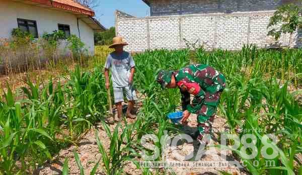 Dalam kegiatan tersebut, Serda Edi Suswanto turut serta membantu Natun, salah satu petani setempat, dalam melakukan pemupukan pada tanaman jagung miliknya.