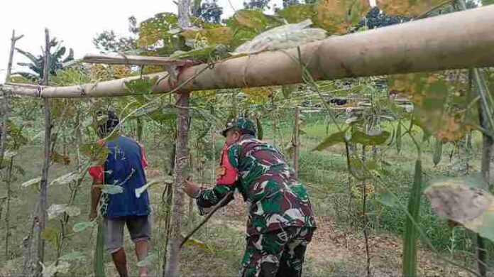PAMEKASAN | SIGAP88 – Dalam upaya mendukung ketahanan pangan di wilayah binaannya, Babinsa Koramil 0826-08 Palengaan, Kopda Hairul Umam melaksanakan komunikasi sosial (komsos) dengan Madsu’i, seorang petani gambas di Dusun Taretah 2, Desa Palengaan Dajah, Kecamatan Palengaan, Kamis (31/7/2025).