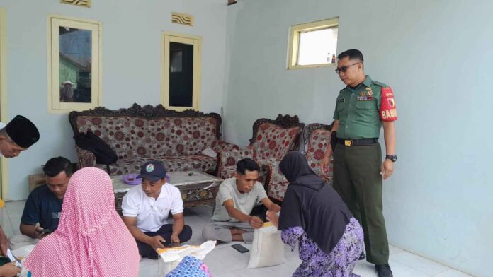Pamekasan | SIGAP88 – Babinsa Koramil 0826-09 Pakong, Sertu Moh Yasin, melaksanakan pendampingan dalam penyaluran bantuan beras dari Bulog di rumah Kepala Desa Klompang.
