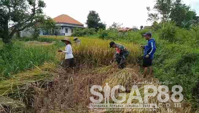 PAMEKASAN | SIGAP88 – Wujud nyata kepedulian terhadap warga binaan, Babinsa Koramil 0826-11 Batumarmar, Serma Agus S, turun langsung ke sawah membantu proses panen padi milik Saleh, warga Dusun Jungudan, Desa Bujur Tengah, Kecamatan Batumarmar, Selasa(8/4)