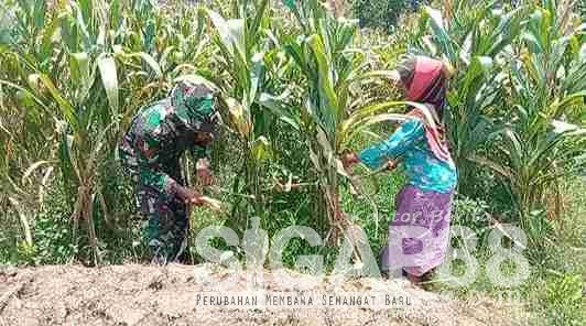 PAMEKASAN | SIGAP88 – Dalam upaya mendukung ketahanan pangan, Babinsa Koramil 0826-11 Batumarmar, Koptu Samsul A, melaksanakan kegiatan pembinaan teritorial (Binter) dengan membantu warga dalam pemeliharaan tanaman jagung.