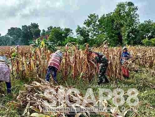 PAMEKASAN | SIGAP88 – Sebagai bentuk dukungan terhadap kesejahteraan petani, Serda Abdus Salam, Babinsa Posramil 0826-12 Kadur, turut serta membantu panen jagung milik Jamaluddin di Dusun Ruberruh, Desa Kertagenah Tengah, Kecamatan Kadur, Kamis (6/3/2025).