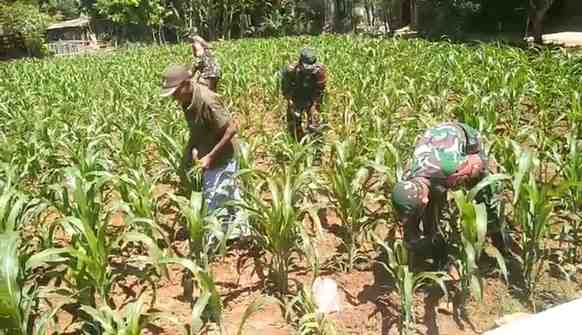Salah satunya seperti yang dilakukan oleh Babinsa Desa Pamoroh, Serda Anis Daeng dan rekannya yang terjun langsung ke lahan pertanian membantu petani membersihkan rumput liar di sekitar tanaman jagung, Selasa (15/7).