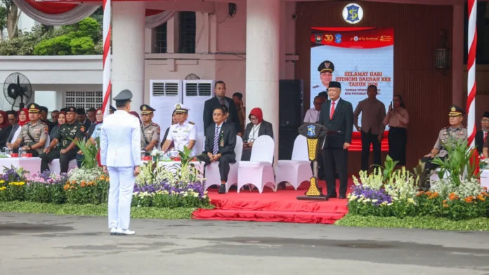 SURABAYA | SIGAP88 – Pemerintah Kota (Pemkot) Surabaya menggelar upacara Hari Otonomi Daerah ke-XXX tahun 2026 di halaman Balai Kota, Senin (27/4/2026) Dengan Mengusung tema “Dengan Otonomi Daerah Kita Wujudkan Asta Cita”, momentum ini menegaskan peran strategis daerah dalam mengelola potensi lokal sekaligus memperkuat sinergi dengan pemerintah pusat.