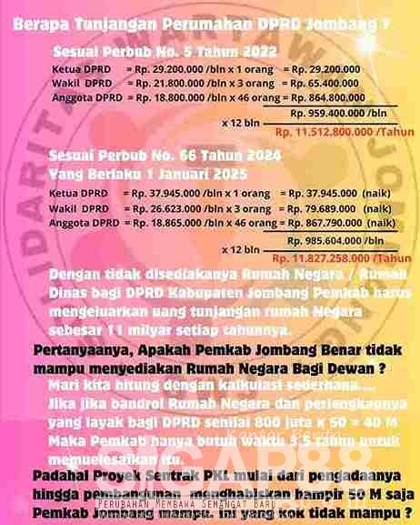 Angka ini semakin meningkat dengan adanya Perbub No. 66 Tahun 2024 yang berlaku mulai 1 Januari 2025. Untuk tahun 2025, tunjangan perumahan anggota DPRD Jombang diperkirakan mencapai Rp. 985.604.000 per bulan atau sekitar Rp. 11,8 miliar per tahun.