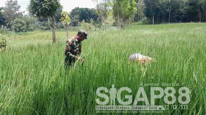 Salah satunya, Serda Supriyadi dari Koramil 0826-09 Pakong yang turun langsung ke sawah membantu petani membersihkan rumput liar di lahan padi milik warga.