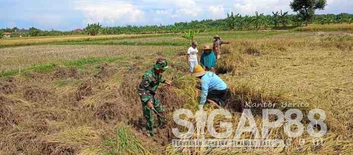 PAMEKASAN | SIGAP88 – Dengan penuh semangat, Babinsa Koramil 0826-06 Pademawu, Serda M. Suyatno, turun langsung ke sawah untuk membantu warga binaannya memanen padi di Kelurahan Barurambat Timur, Kecamatan Pademawu, Kabupaten Pamekasan, Selasa (25/03/2025).