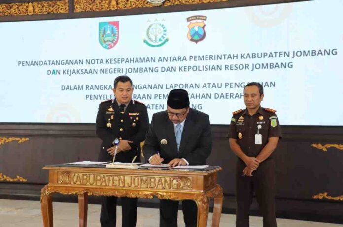 Jombang | SIGAP88 – Pemkab Jombang bersama Kejaksaan Negeri (Kejari) Jombang dan Polres Jombang resmi menandatangani Nota Kesepahaman (MoU) tentang Koordinasi Aparat Pengawas Internal Pemerintah (APIP) dan Aparat Penegak Hukum (APH) dalam Penanganan Laporan atau Pengaduan Penyelenggaraan Pemerintahan Daerah Kabupaten Jombang.