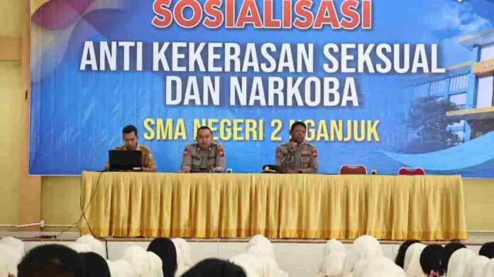 NGANJUK | SIGAP88 – Polres Nganjuk melalui Satuan Binmas melaksanakan kegiatan sosialisasi penanggulangan kekerasan seksual dan bahaya penyalahgunaan narkoba kepada ratusan pelajar SMA Negeri 2 Nganjuk, Selasa (7/10/2025).