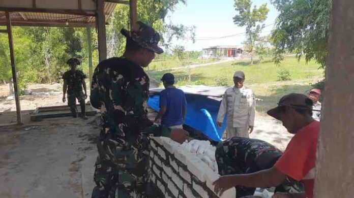 Tampak anggota Satgas TMMD bersama warga bahu membahu mengangkat dan menyusun bata dengan penuh semangat.