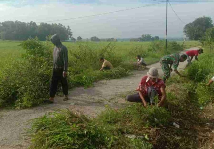 Dalam kegiatan tersebut, Babinsa bersama warga melaksanakan karya bakti berupa pembersihan saluran air dan jalan desa.